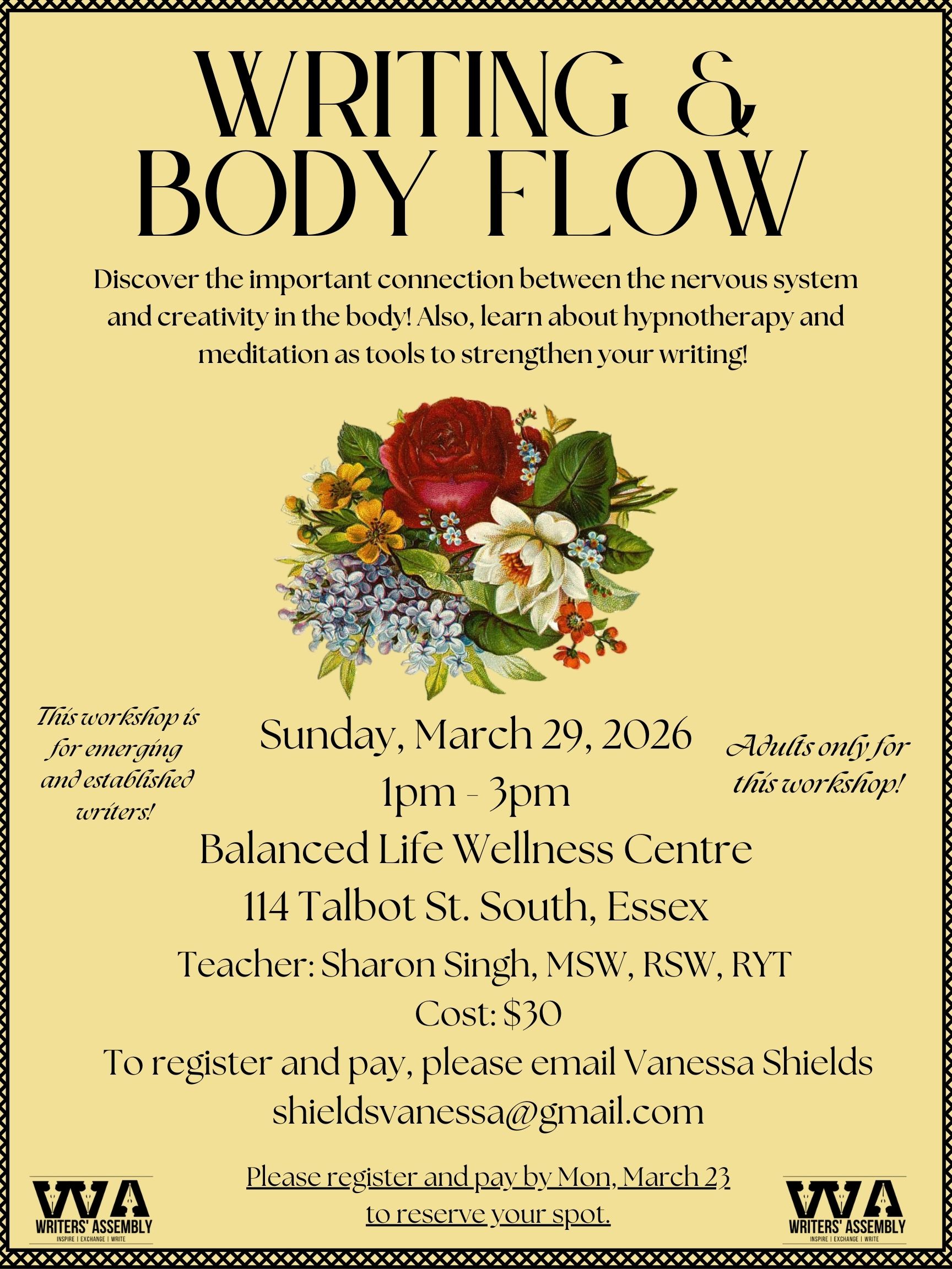 Balanced Life Wellness Centre 114 Talbot St. South, Essex, Ontario, CanadaWriter's Assembly Writing & Body Flow Hosted by: Balanced Life Wellness Centre With: Sharon Singh Date/Time: Sunday March 29th, 2026 / 1:00-3:00pm Cost: $30/person (sign up & pay by March 23rd) Description: […]